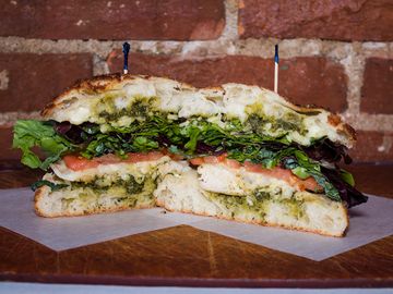 Chicken, Homemade Pesto, Mozzarella, Red Onion, Tomato & Local Mixed Greens on Ciabatta