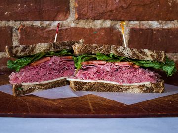 Corn Beef, Beef Pastrami, Swiss, Tomato, Leaf Lettuce, Red Onion & a Horseradish Mustard