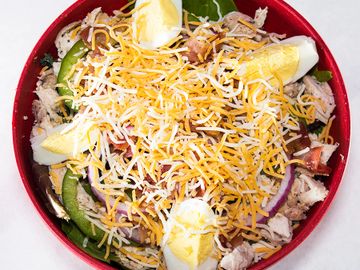 Chicken, Crumbled Bacon, Bell Peppers, Red Onion, Hard Boiled Egg, Shredded Colby Jack Cheese & topped w/ BBQ Sauce