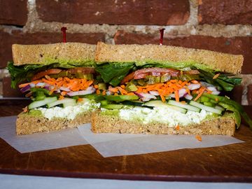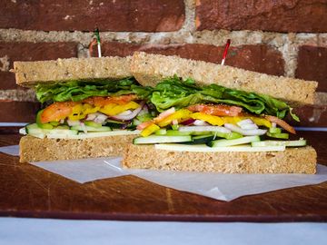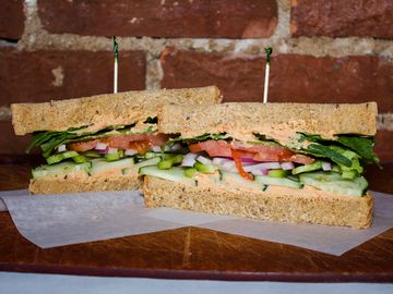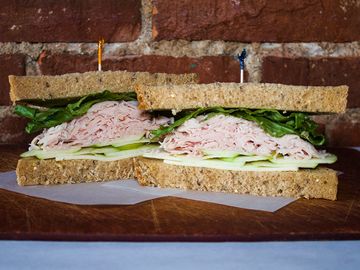 Piled High Turkey & Bacon, Swiss, Cucumber, Ranch Seasoning, Leaf Lettuce, Tomato & our House Dill Mayo