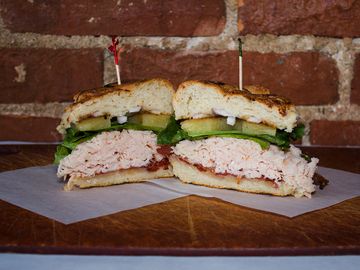 Our Homemade Albacore Tuna Salad(albacore tuna, celery, pickles, red pepper, garlic & a little of our house made dill Mayo)Provolone, House Dill Mayo, Leaf Lettuce,Tomato & a little Garlic Pepper Seasoning